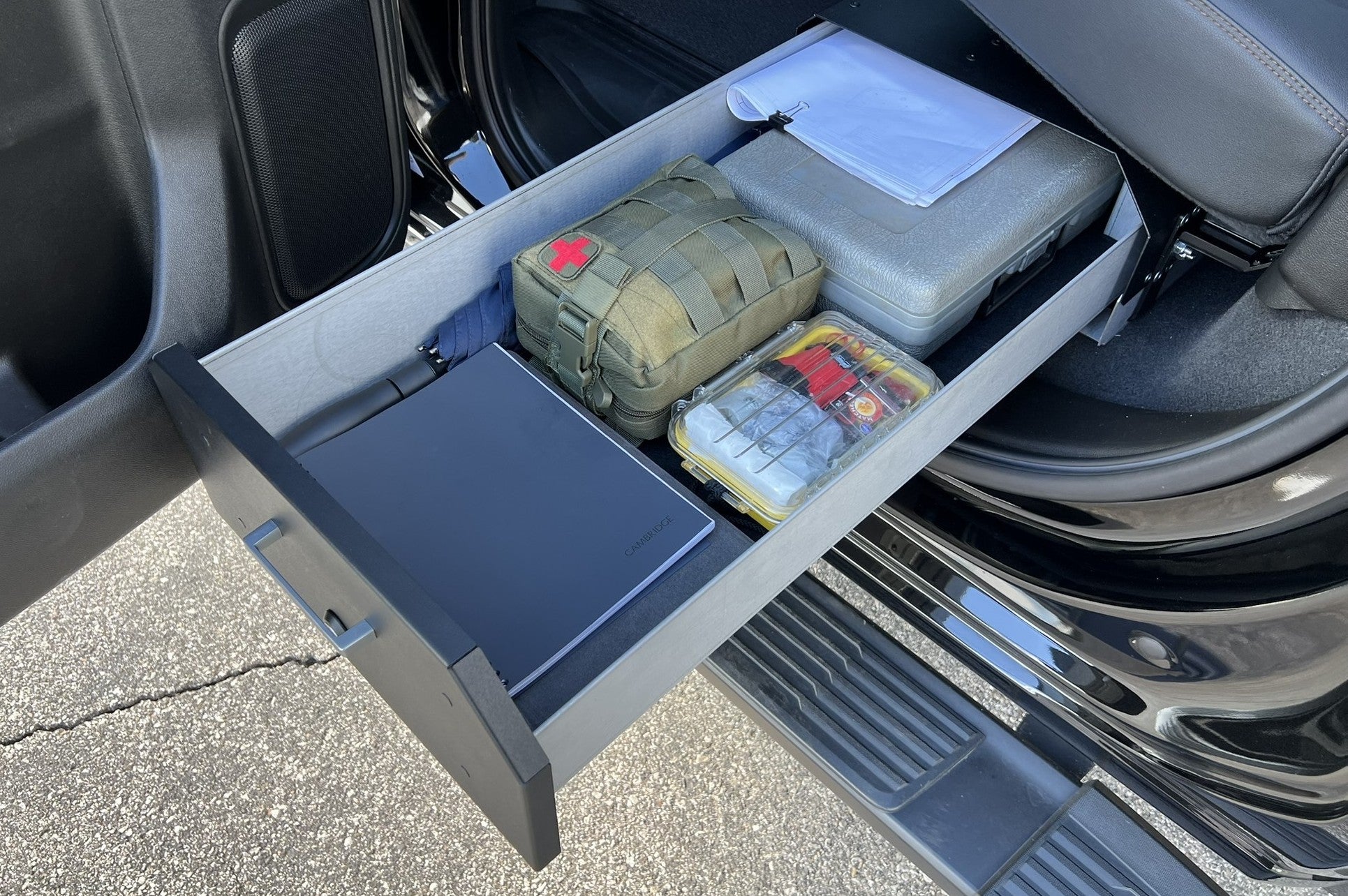 The fact that the drawer slides out the rear driver's side door makes accessing your items and locking things up incredibly convenient, especially in tight spaces. This is a well-thought-out, well-constructed piece of equipment that deserves a full five stars. Highly recommended!